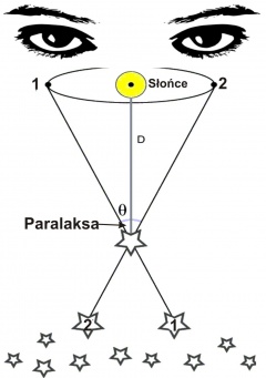 Paralaksa, to kąt związany z widzeniem przedmiotu na tle odległego ekranu z dwóch różnych miejsc. Autor: L. Błaszkiewicz