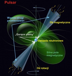 Schemat budowy pulsara – rotującej i emitującej promieniowanie gwiazdy neutronowej. Autor: L. Błaszkiewicz