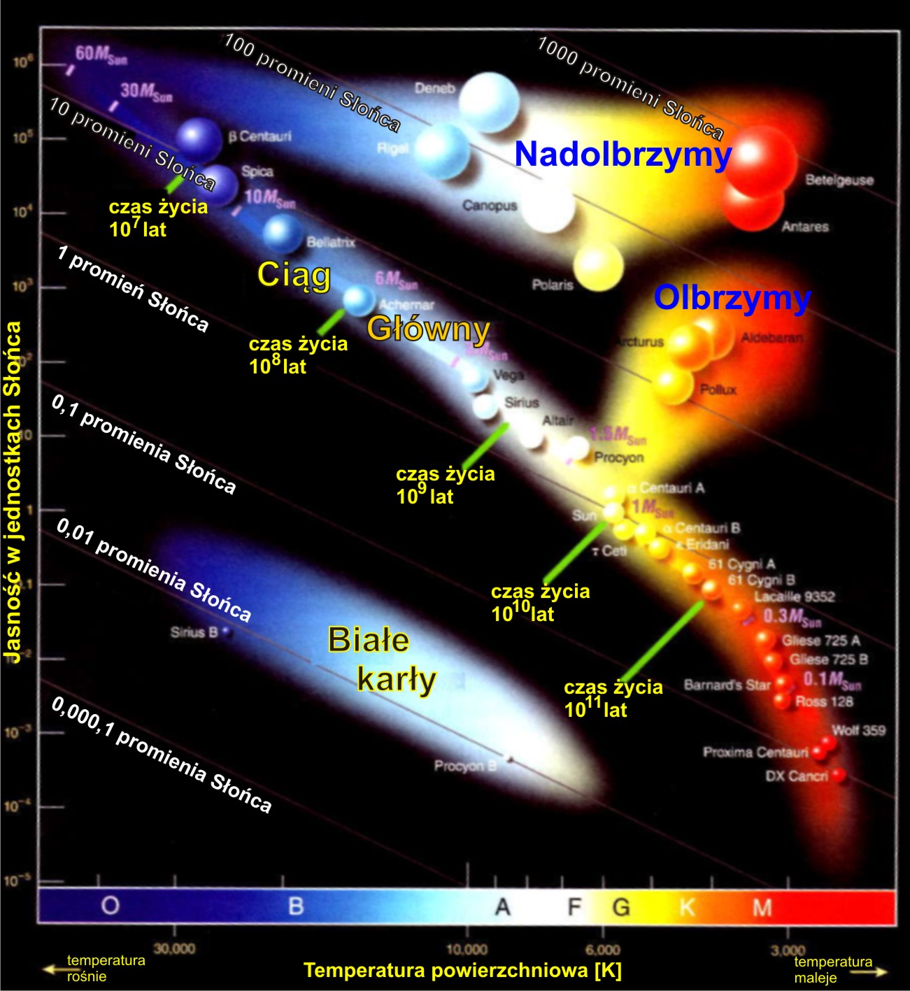 Wykres HR pokazujący zależność miedzy jasnością a temperaturą (typem widmowym) gwiazd. Zaznaczono podstawowe grupy gwiazd, ich masy, promienie oraz czas życia. Autor: na podstawie źródła internetowego - L. Błaszkiewicz